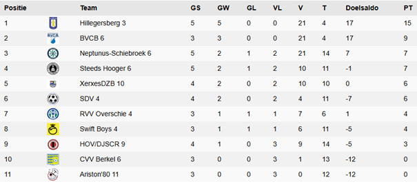 Volgende week een weekje rust. Op 8 november wacht RVV Overschie. Met 9 punten uit 3 wedstrijden staat BVCB 6 inmiddels stevig op plek 2.
