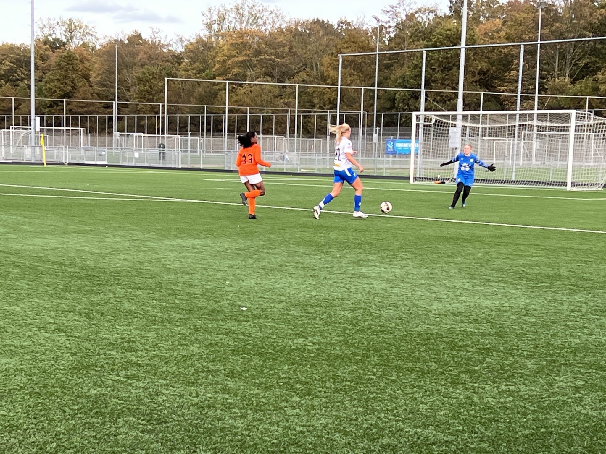 In de 35e minuut kon Michelle met een verre bal Melissa bereiken. Zij wist haar tegenstander uit te spelen en een voorzet te geven. Desiré was ter plaatse, maar kon de voorzet niet tot doelpunt promoveren. BVCB zette een tandje bij en in de 36e minuut viel de gelijkmaker wel. Een mooie aanval, waarbij Finett was mee geslopen vanuit de verdediging, ging via de rechterkant. Uiteindelijk kon Melissa de bal voor het doel spelen. Finett kreeg de bal en schoot hard op het doel. De keeper stond goed opgesteld en daardoor moest de bal scherp in de hoek. Finett deed dat goed, alleen klonk het mooie geluid van het aluminium. De paal stond een doelpunt in de weg. De bal kaatste weer het veld in en kwam hoog ter hoogte van de penaltystip terecht. Desiré was goed meegelopen en controleerde de bal “rustig” om deze geplaatst in de andere hoek van het doel te schieten. Eindelijk de 1-1 op het scorebord.