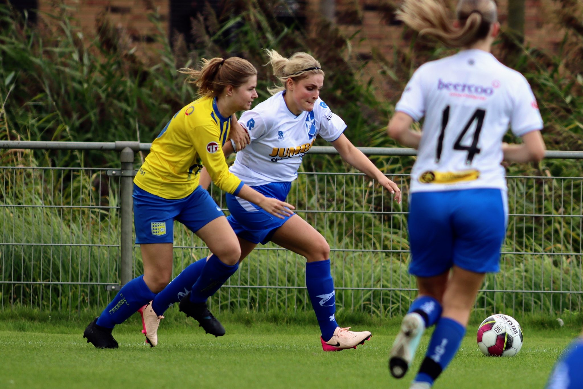 De eerste minuten was even aftasten, maar al in de 3de minuut was het BVCB dat een snelle aanval op de “mat” legde. De bal werd vanuit het middenveld naar de rechterkant gespeeld, waar Melissa de bal kon aannemen en diep spelen achter de verdediging. Desiré was sneller dan haar tegenstanders en kon de bal meenemen richting het doel. Op het juiste moment werd de bal in het hoekje geschoten en stond het plotseling 0-1! Heel goed gedaan dames en nu volhouden.